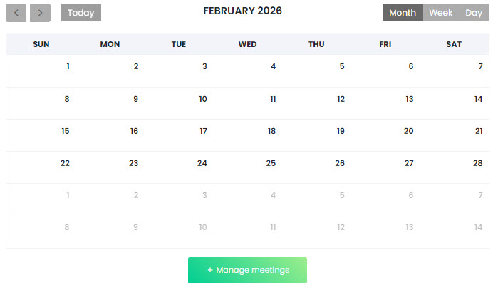 Once the video call provider has been selected in the course settings, a new lesson component called Meetings will become available. When accessing this component, a calendar with the scheduled sessions will be displayed along with the Manage meetings button.