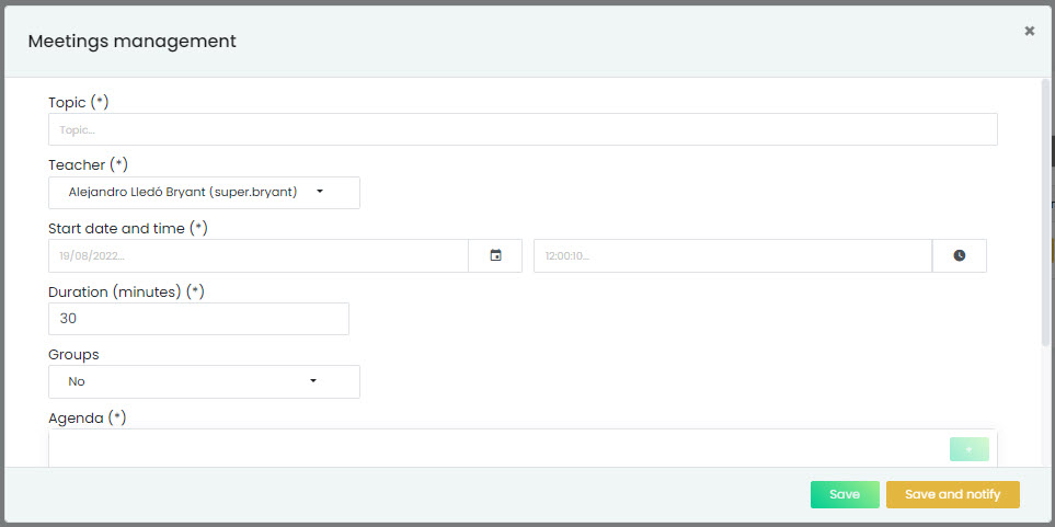 In this form, you will be able to define the meeting topic, as well as its date and time. You will also find an Agenda field where you can include preliminary information or the content to be covered.